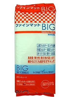 サンミューズの大判ウールマットです。細かい繊維構造で微細なゴミまでしっかりキャッチし、水の透明度を高めます。BIGサイズのため自由にカットして様々なフィルターに対応でき、コスパよく使えます。物理ろ過の仕上げ段として最前段のスポンジの後ろに置くのがおすすめです。